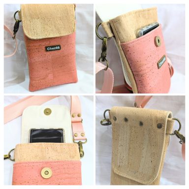 £33. Crossbody with adjustable strap, 3 pockets for a phone, wallet, keys etc. Pink cork fabric finish with a natural cork flap. 13/21/2cm